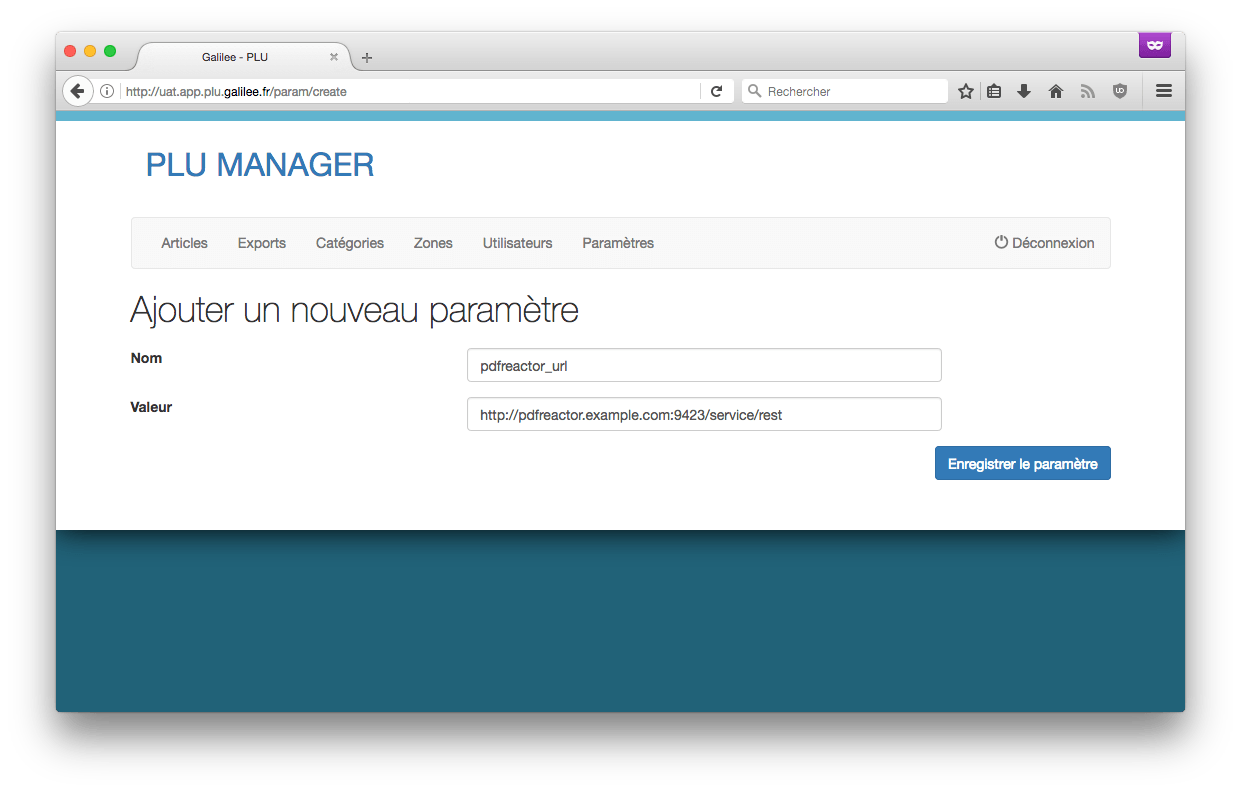 Aller ensuite dans « Paramètres » et ajouter la clé de configuration pdfreactor_url, celle ci est du type http://<host>:9423/service/rest.